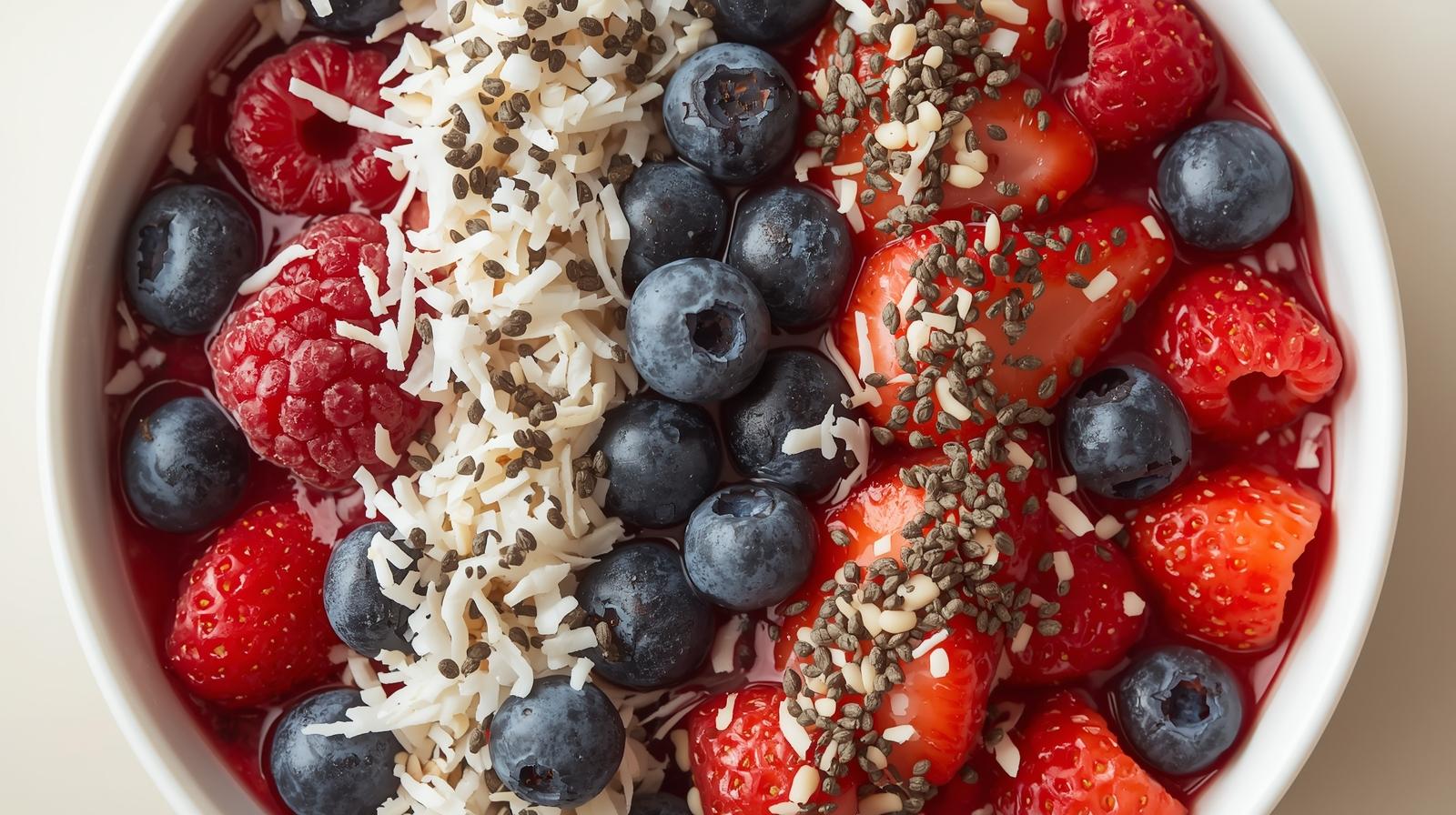 Add on meal topper made with raspberries, blueberries, strawberries, coconut oil, chia seeds.